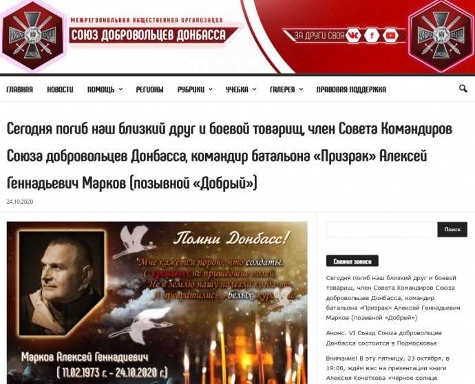 На сайте объединения участников незаконных вооруженных формирований ОРДЛО 24 октября появилось сообщение о смерти главы батальона боевиков "Призрак" Алексея Маркова.