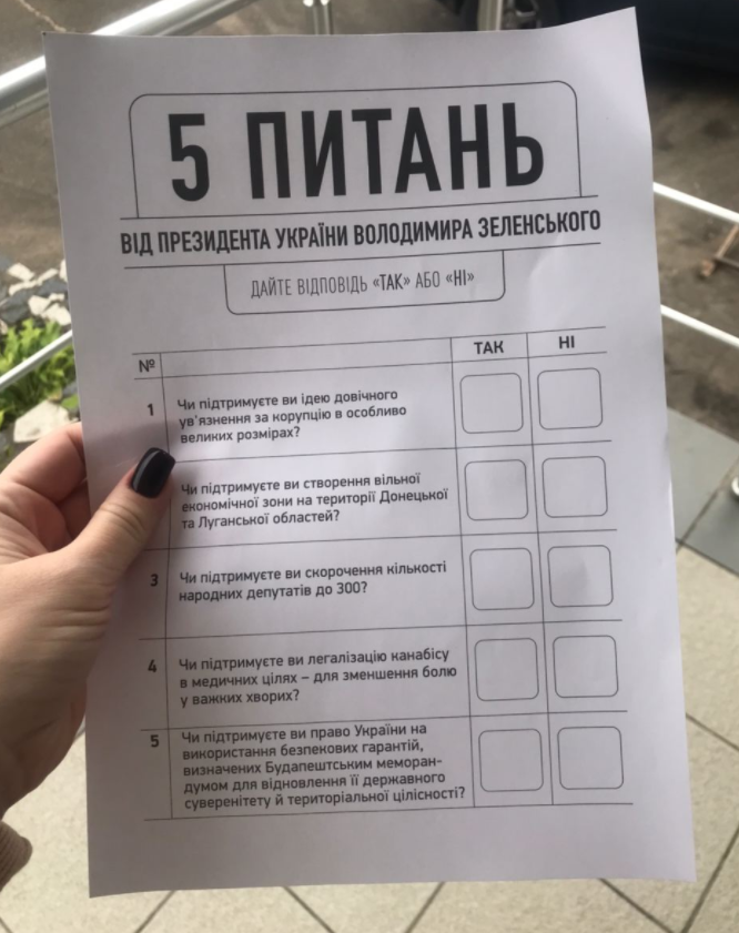 Напомним: Одновременно с местными выборами в воскресенье проходит инициированный Зеленским всенародный опрос, на котором гражданам предлагают ответить на 5 вопросов: нужно ли вводить в стране пожизненное заключение за коррупцию в особо крупных размерах; поддерживают ли они создание на Донбассе свободной экономической зоны; поддерживают ли сокращение численного состава Верховной Рады с 450 до 300 народных депутатов, легализация медицинского каннабиса и поднятие на международном уровне вопроса об использовании гарантий безопасности, определенных Будапештским меморандумом.