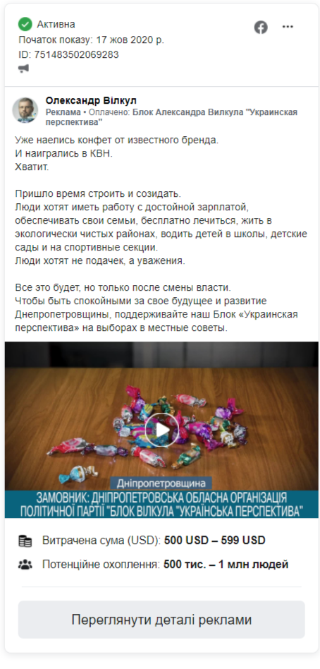 Александр Вилкул, отец которого снова баллотируется в мэры Кривого Рога, опубликовал сообщение, которое критикует других участников избирательного процесса и агитирует голосовать за "Блок Александра Вилкула "Украинская перспектива". По состоянию на 10:15, по оценкам Facebook, рекламу просмотрели около 250-300 тыс. пользователей, а потрачено на нее было от 500 до 599 долларов.
