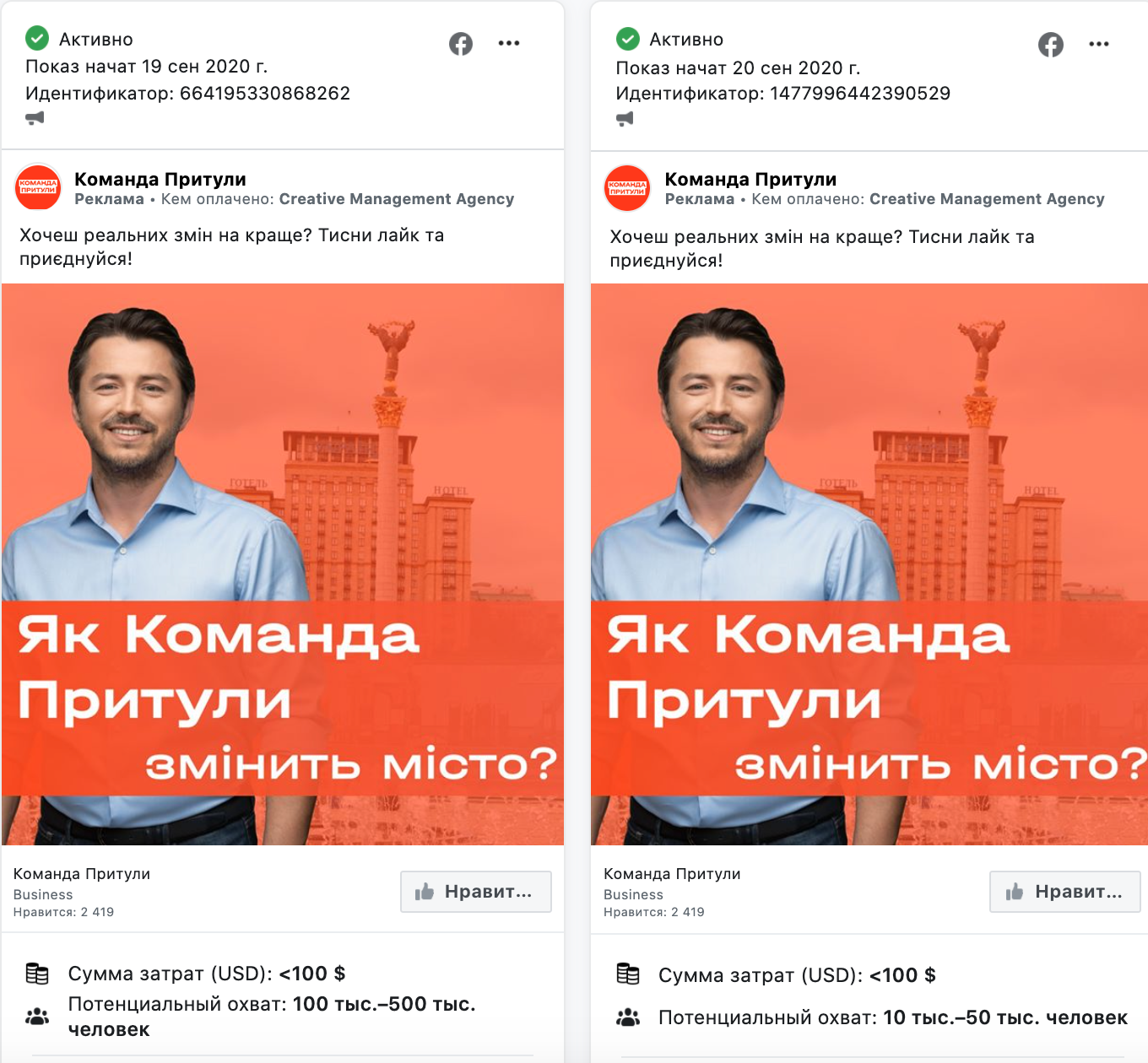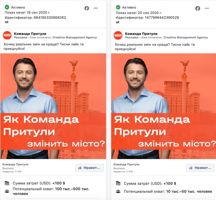 Кандидат на должность городского главы Киева от партии "Голос" Сергей Притула продолжает рекламировать два сообщения от 19 и 20 сентября, где призывает поддержать его команду на выборах. На каждое сообщение было потрачено менее 100 долларов, а увидели их менее 1000 пользователей каждый.