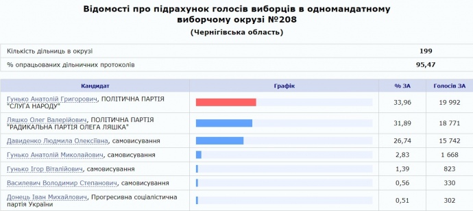 В одномандатном избирательном округе №208 в Бахмаче по результатам обработки 95,47% протоколов кандидат в народные депутаты от "Слуги народа" Анатолий Гунько оторвался от лидера "Радикальной партии" Олега Ляшко на 2,07%.