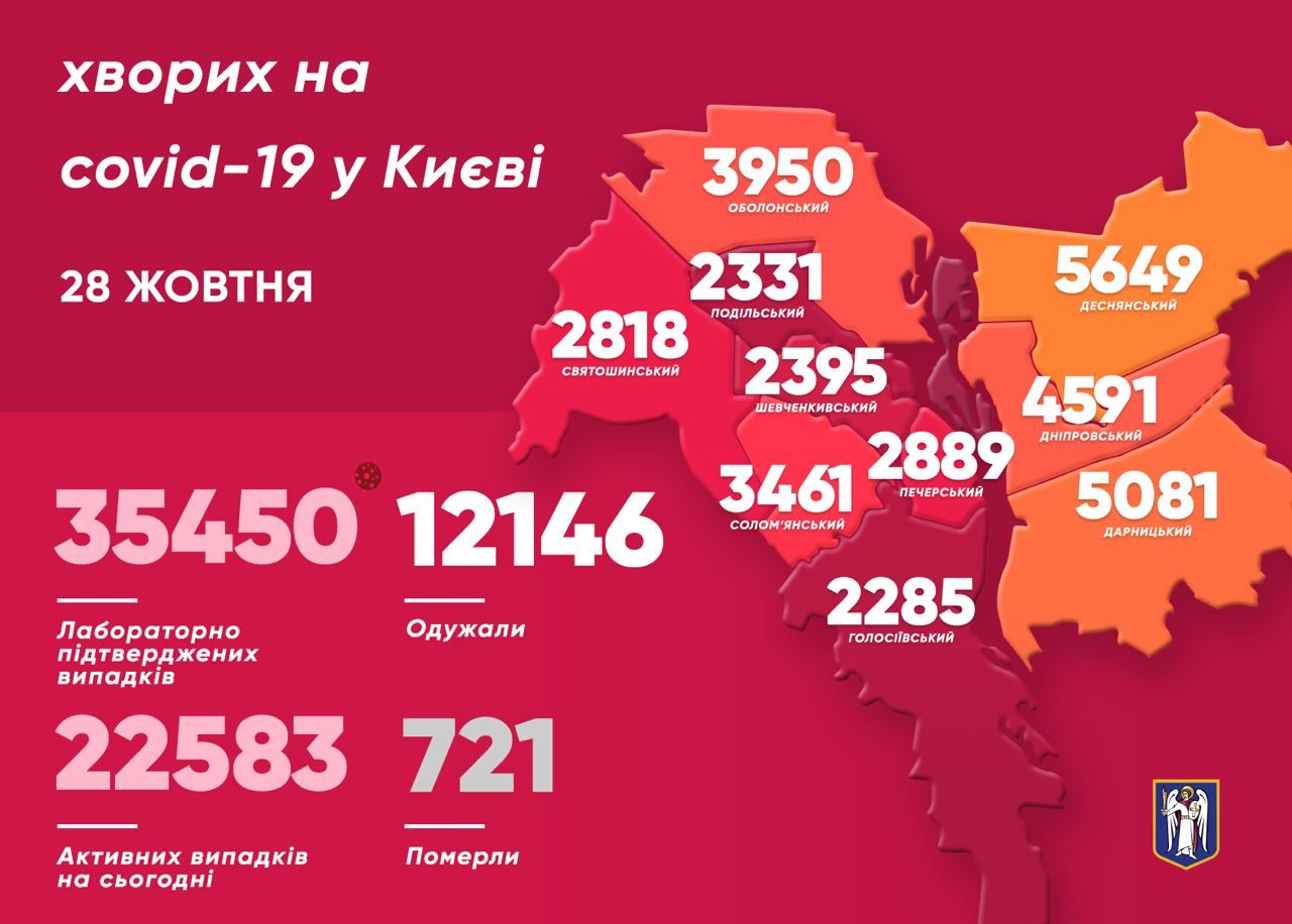 Всего за время пандемии в Киеве зарегистрировали 35 450 подтвержденных случаев заболевания COVID-19, преодолели коронавирус 12 146 жителей столицы, но коронавирусная болезнь унесла жизни 721 киевлянина.