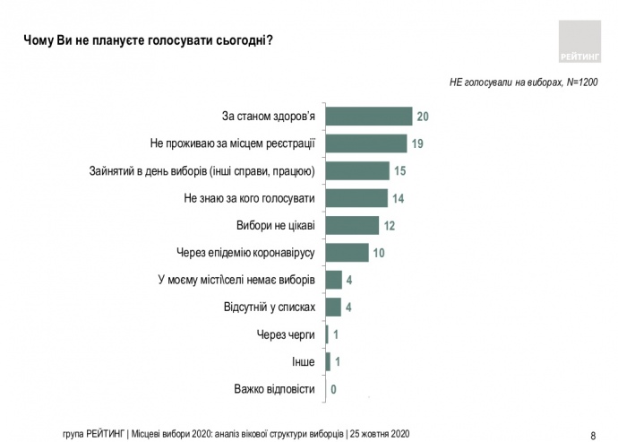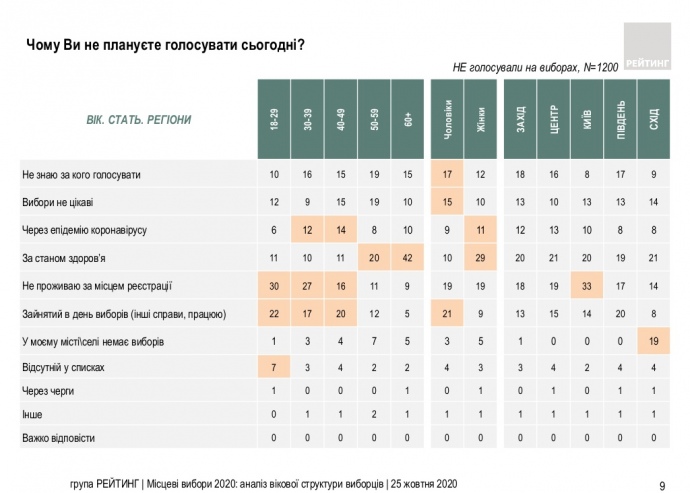 Для старших респондентов основной причиной не идти на выборы было здоровье, а для молодежи – занятость в день выборов и проживание не по месту регистрации (особенно актуально для Киева).