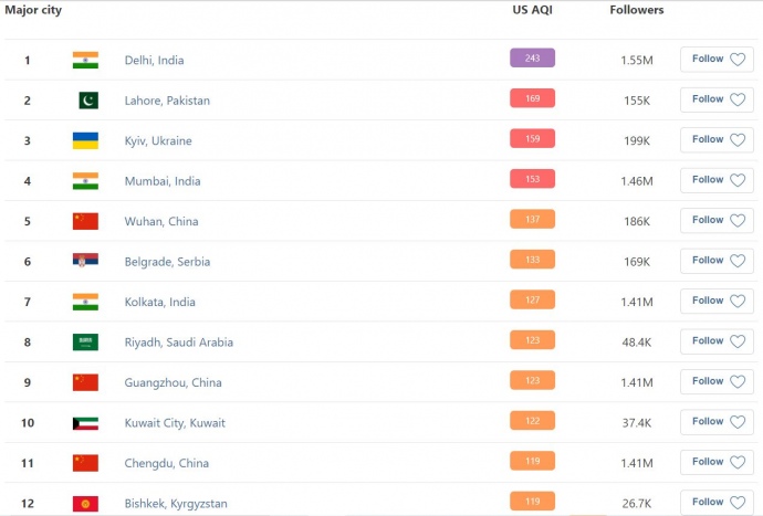 Киев опережают в антирейтинге только индийская столица Дели и пакистанский Лахор.