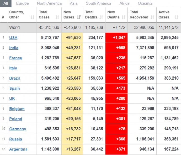 28 октября коронавирус обнаружили у почти 546 тысяч человек, что является рекордным показателем за время пандемии.