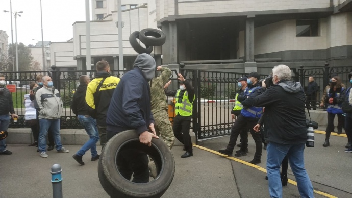 Группа людей во главе с активистом "Евромайдана" и бывшим нардепом Владимиром Парасюком забросила через забор суда шины