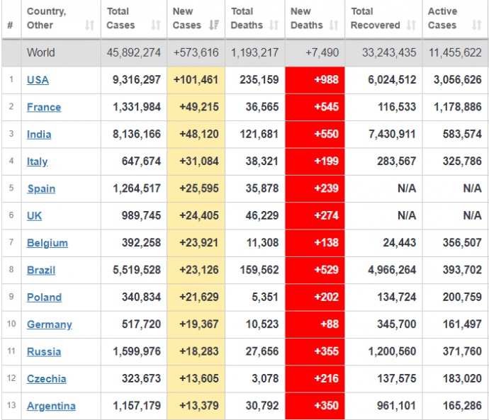 По информации за 29 октября коронавирус обнаружили у 573 тысяч человек. Больше всего в США, Франции и Индии.