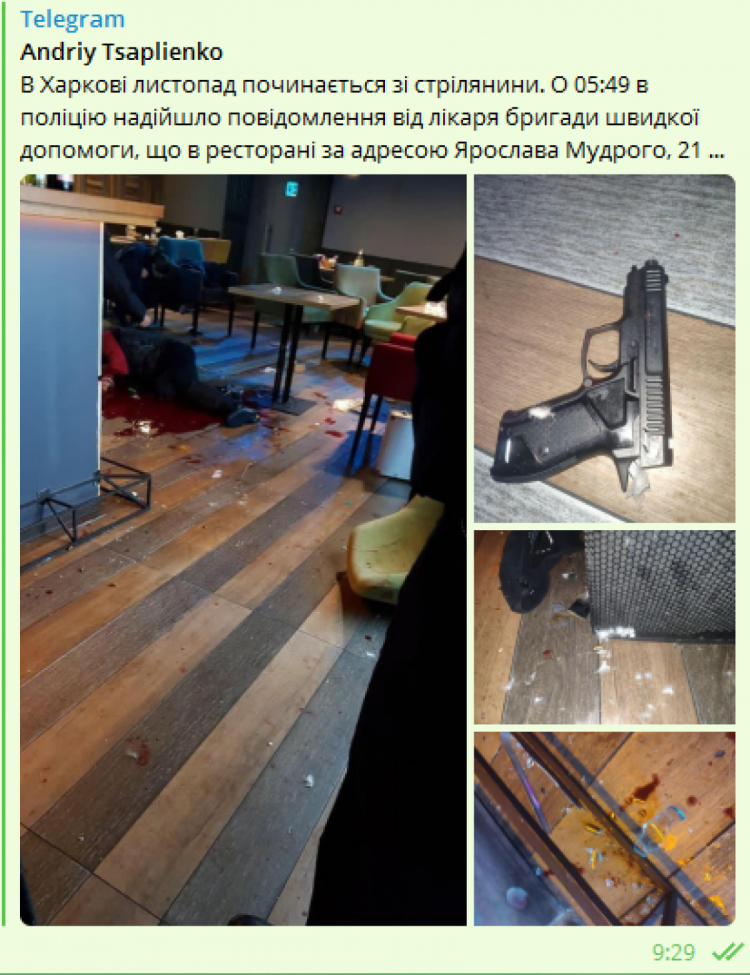 Детали: Утром 1 ноября в СМИ со ссылкой на сообщение журналиста Андрея Цаплиенко появилась информация о стрельбе в харьковском ресторане Biani Champagneria по адресу Ярослава Мудрого, 21.