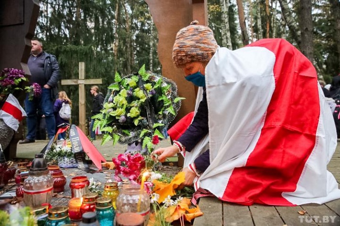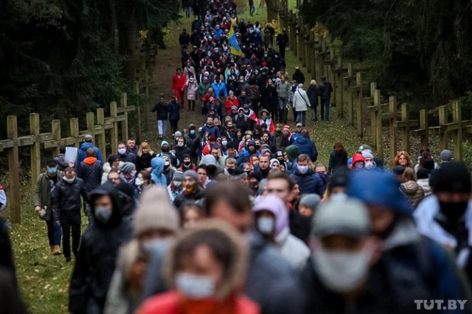 По разным оценкам, от 500 до нескольких тысяч протестующих смогли пройти к урочищу. Они возложили цветы к куропатским крестам, зажгли свечи.
