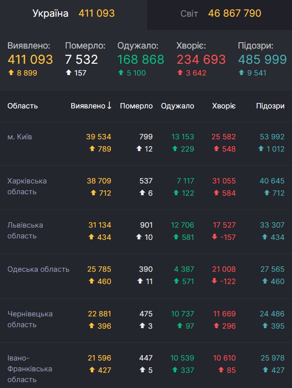 Всего за время пандемии в Украине обнаружили 411 093 случая коронавируса SARS CoV 2. Из них 7 532 больных умерли, а 168 868 человек выздоровели.