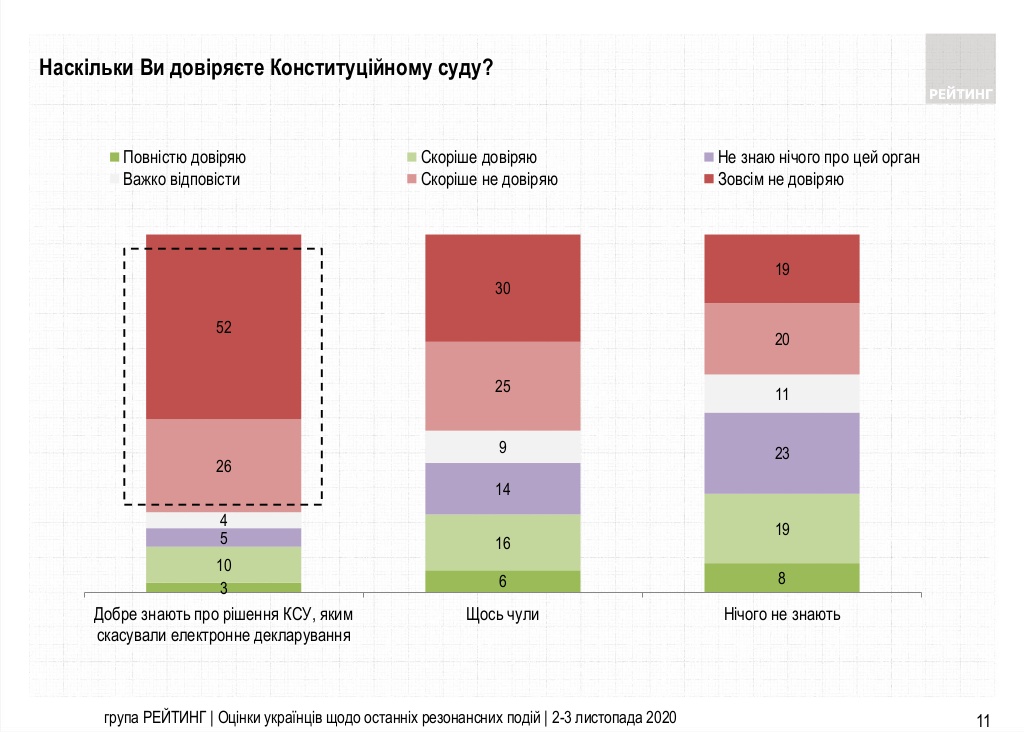 Среди респондентов, которые хорошо знакомы с содержанием решения об "отмене электронного декларирования для чиновников", недоверие к институции составляет почти 80%.
