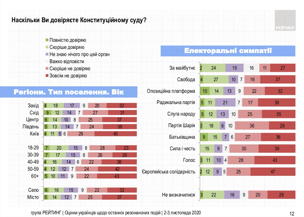 Больше всего не доверяют Конституционному суду сторонники "Европейской солидарности", "Голоса", "Батькивщины", партии Шария, партий "Сила и честь" и "Слуга народа".