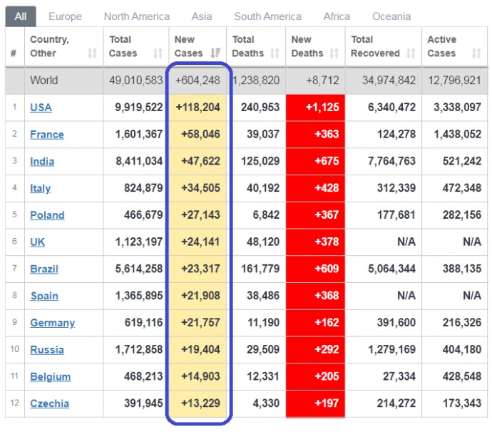 По состоянию на момент публикации, в мире зафиксировано 49 миллионов случаев заражения. Успешно перенесли болезнь и вылечились 35 миллионов человек 1 239 375 пациентов умерли.