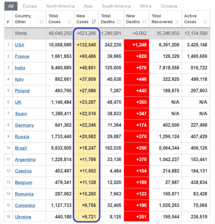 В странах Европы лидерами антирейтинга по количеству новых случаев COVID-19 является Франция, Италия, Польша, Великобритания и Украина, которая занимает 11-е место. В соответствующем мировом антирейтинге Украина находится на 16-м месте.
