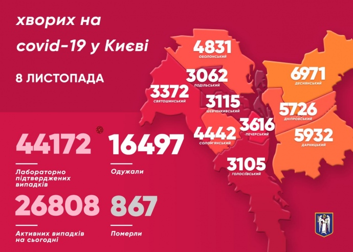 Всего с начала эпидемии в Киеве обнаружили 44 172 случаев заболевания COVID-19, 867 киевлян умерли и 16 497 выздоровели.