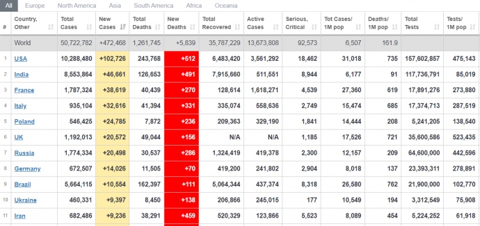 Сейчас болеет 13,6 млн человек, вылечились – 35,7 млн, умерло – 1 миллион 261 тысяча инфицированных.