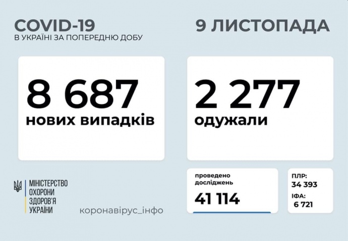 За минувшие сутки, 8 ноября, коронавирусную болезнь COVID-19 обнаружили у 8 687 жителей Украины, госпитализировали 1 100 больных, умерли 115 пациентов, выздоровели 2 277 человек.