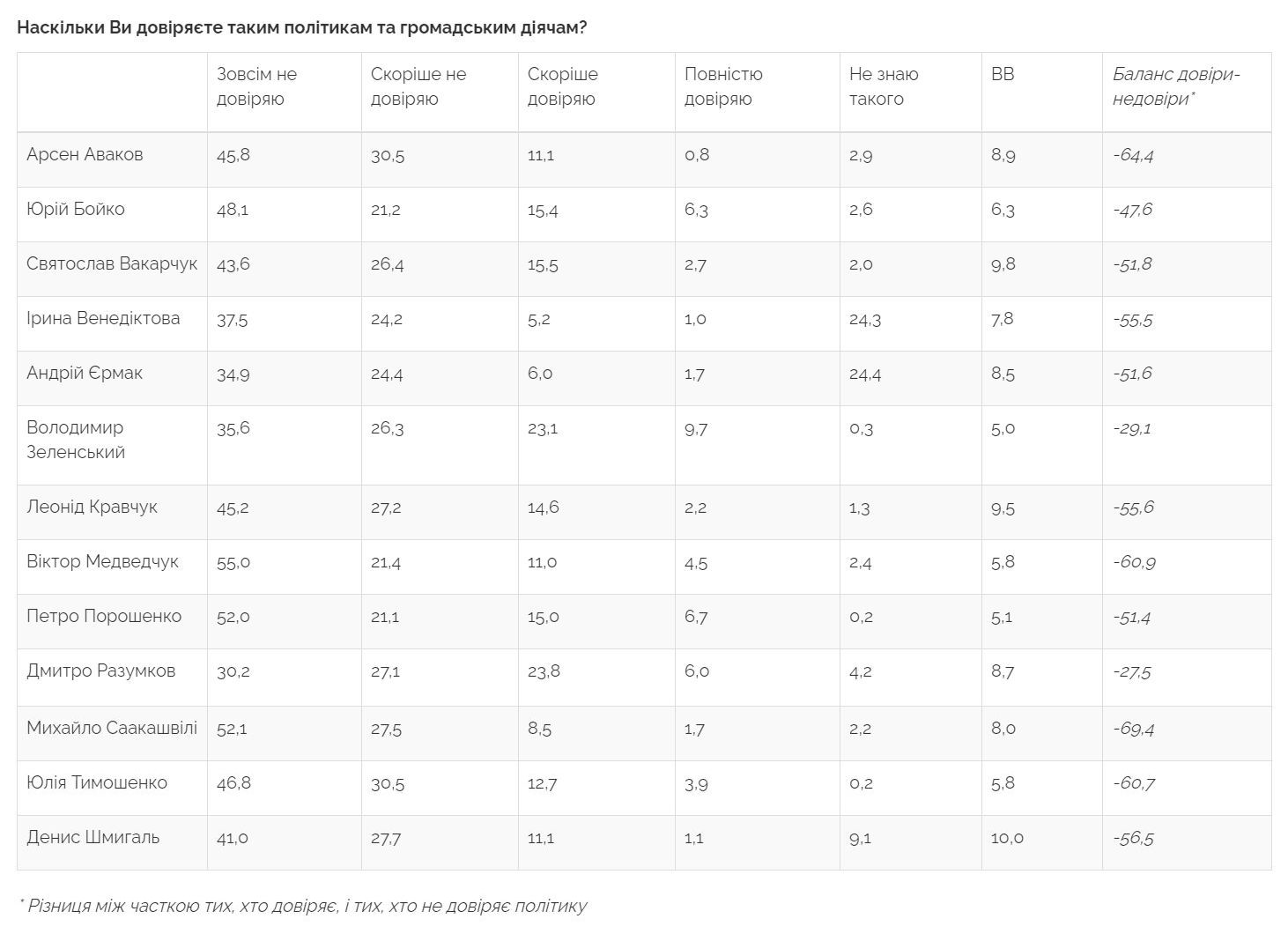 Баланс доверия и недоверия наилучший у Разумкова (-27,5) и Зеленского (-29,1), наихудший у Авакова (-64,4) и Саакашвили (-69,4).
