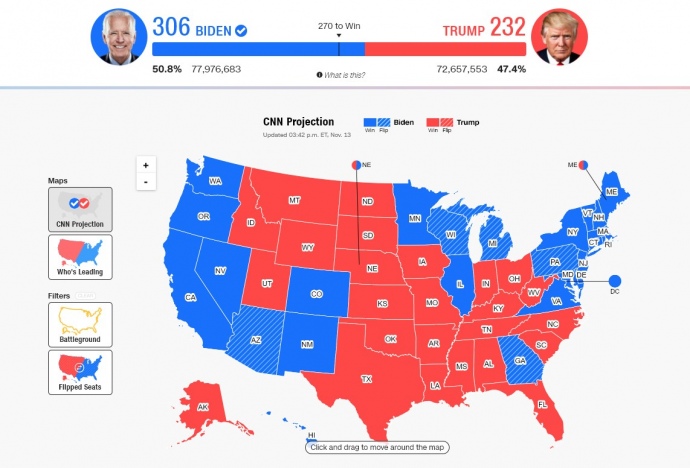 Победа приводит к окончательному итогу голосов выборщиков - 306 голосов за Байдена и 232 голоса за Трампа.