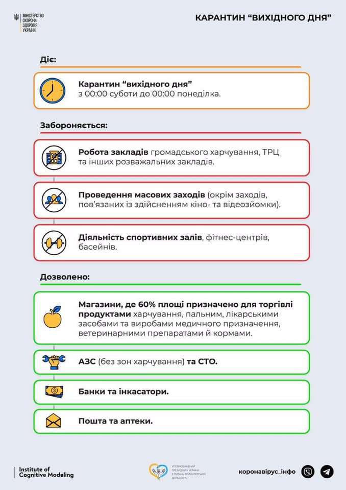 - Карантин выходного дня, в частности, предусматривает, что закрываются учреждения торгового и бытового обслуживания населения, кроме заведений торговли продуктами питания (если минимум 60% торговой площади отведены для продажи еды), топливом, лекарственными средствами и медицинскими изделиями, ветеринарными препаратами.
