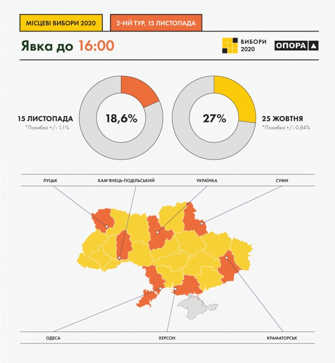 По информации гражданской сети ОПОРА, во время повторного голосования интегрированная явка избирателей в 7 городах в 16:00 составила 18,6%.