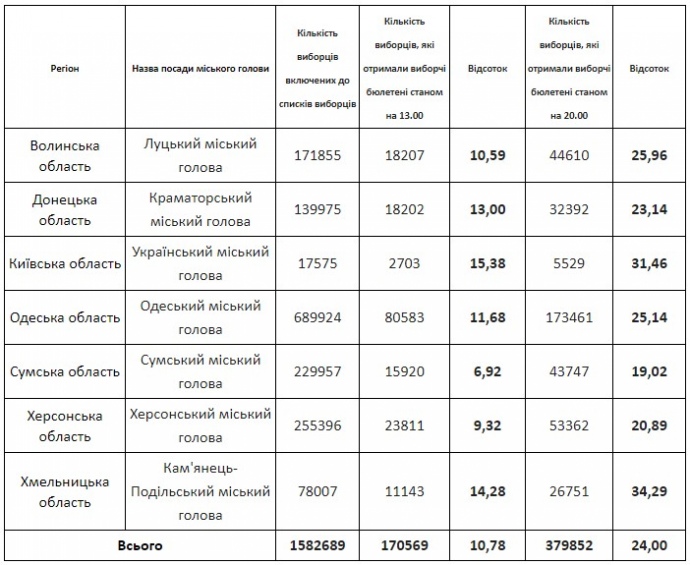 Дословно: "По сообщениям всех территориальных избирательных комиссий, осуществляющих сегодня подготовку и проведение повторного голосования по выборам городских голов, явка составила 24%".