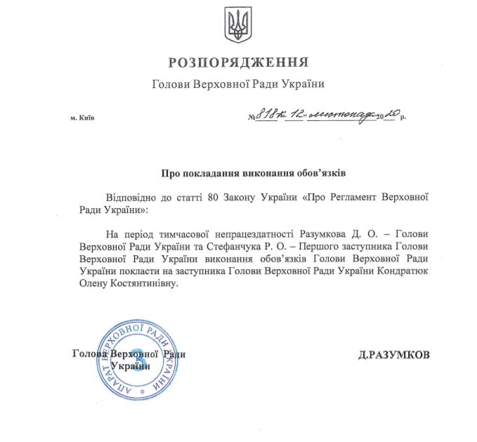 - 11 ноября спикер парламента Дмитрий Разумков сообщил, что получил положительный результат теста на COVID-19.