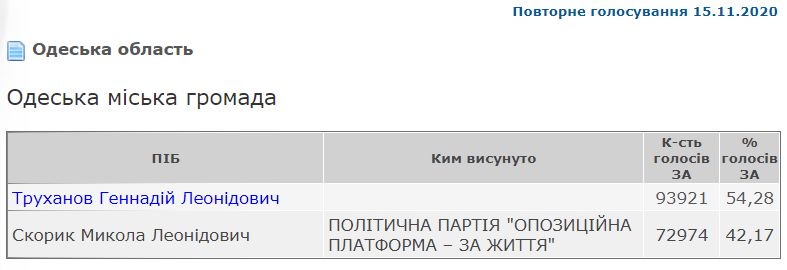 Детали: Во время повторного голосования 15 ноября Труханов получил 54,28% голосов избирателей, а его оппонент от ОПЗЖ Скорик – 42,17%.