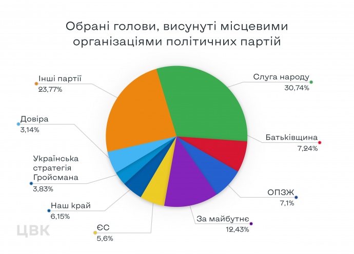 "Слуга народа" победила почти на трети выборов сельских, поселковых, городских голов от общего количества - 30,74%.
