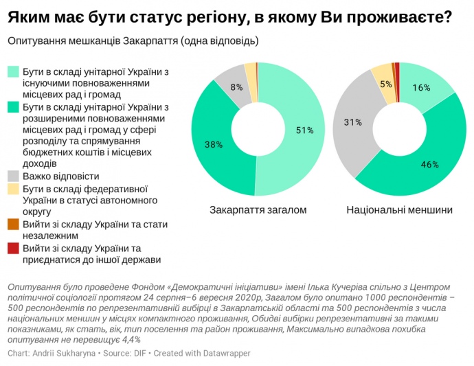 В составе унитарной Украины с существующими полномочиями местных советов и общин видят свой регион 51% жителей Закарпатья целом, 38% выступают за расширение полномочий в сфере в сфере распределения и направления бюджетных средств и местных доходов для местных властей.