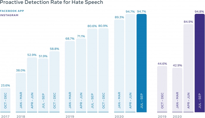 В III квартале в Facebook приняли меры в отношении 22,1 миллиона публикаций, авторы которых разжигали ненависть, причем подавляющее большинство публикаций было удалено заблаговременно, то есть еще до получения жалоб недовольных пользователей.