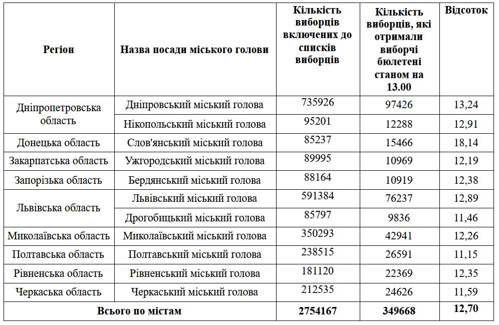 Средняя явка избирателей на выборах городских голов в воскресенье по состоянию на 13:00 – около 13%.