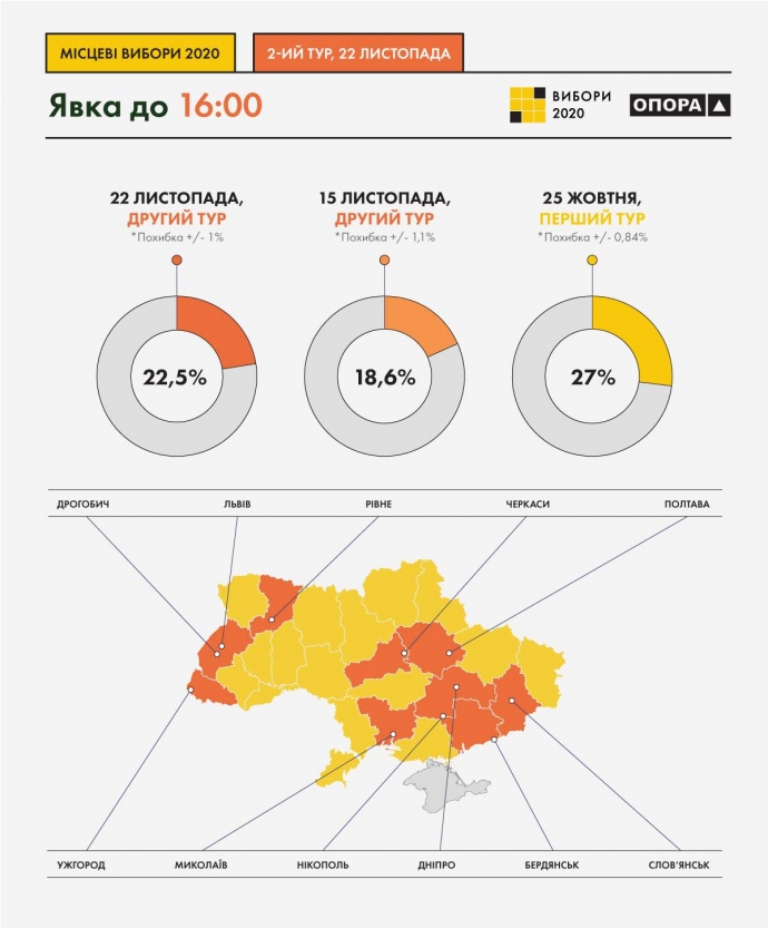Дословно: "По информации от наблюдателей "ОПОРЫ", во время повторного голосования 22 ноября интегрированная явка избирателей в 11 городах по состоянию на 16:00 составила 22,5% (погрешность составляет 1%)".