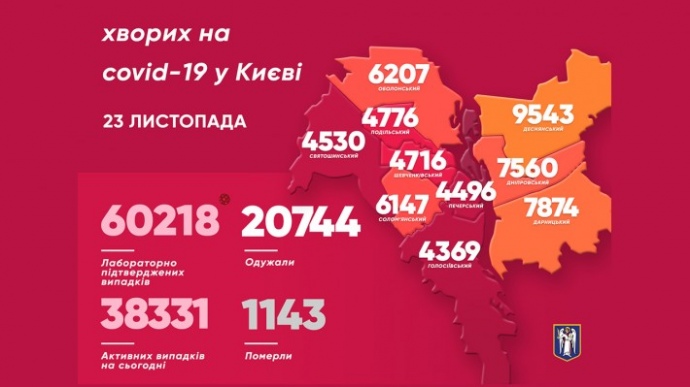 Коронавирусом в Киеве за минувшие сутки заболели еще 1212 киевлян, 20 человек умерли.