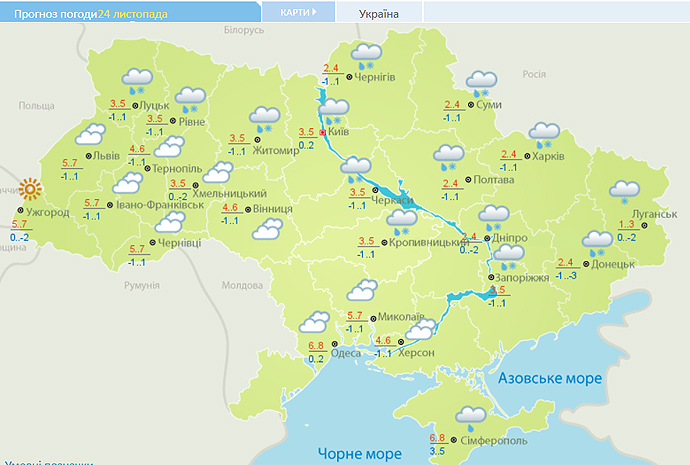 Прямая речь Диденко: "На Севере, Востоке, в центральной части, в Приазовье и в Крыму повышенная влажность будет провоцировать осадки, во время которых будет неуютно. Будет преобладать дождь, на востоке – с мокрым снегом. На значительной части территории Юга и Запада Украины – без существенных осадков".