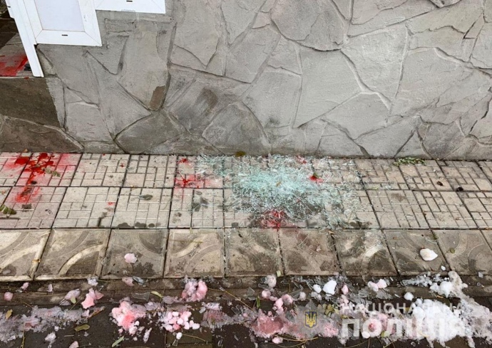 Неизвестные разбили окна и разрисовали стены двух партийных офисов в Мариуполе.