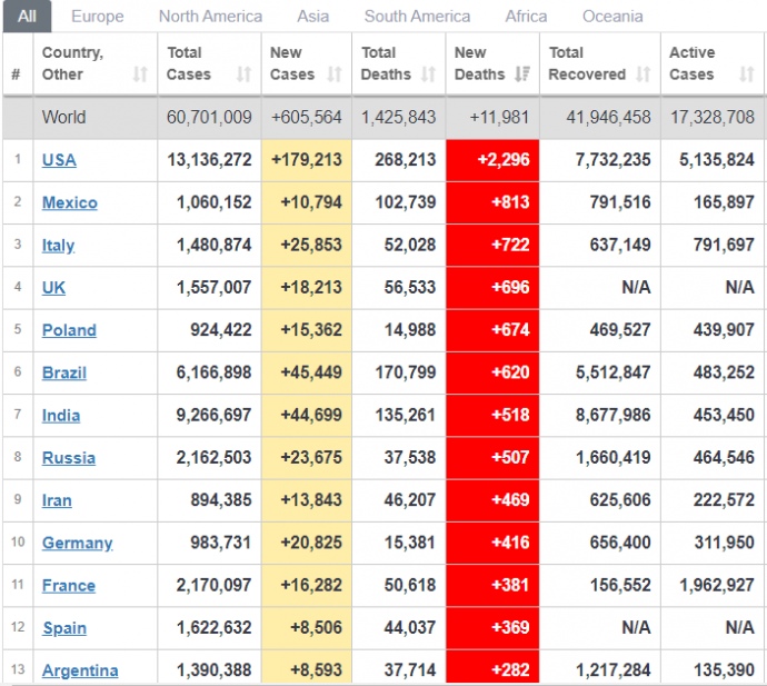 Детали: Больше всего жертв зарегистрировали в США – 2,3 тысячи. Почти в три раза меньше летальных случаев обнаружили в Мексике. В Италии также наблюдается значительный уровень смертности – более 700 человек за сутки.