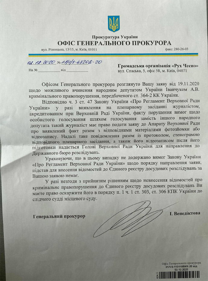 В своем ответе генпрокурор утверждает, что оснований для открытия уголовного производства нет, потому что якобы не были соблюдены требования регламента ВРУ "относительно порядка направления заявления".