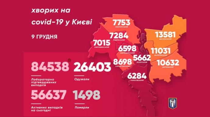 Подтвержденных случаев коронавируса по состоянию на 9 декабря уже 84 538. Преодолели болезнь 26403 жителя Киева, 1498 случаев - летальные.