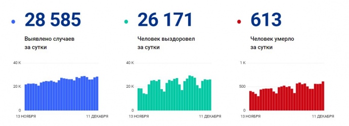 По состоянию на утро 11 декабря в России зарегистрированы 28 585 новых случаев заражения коронавирусной инфекцией и 613 летальніх случаев от коронавируса.