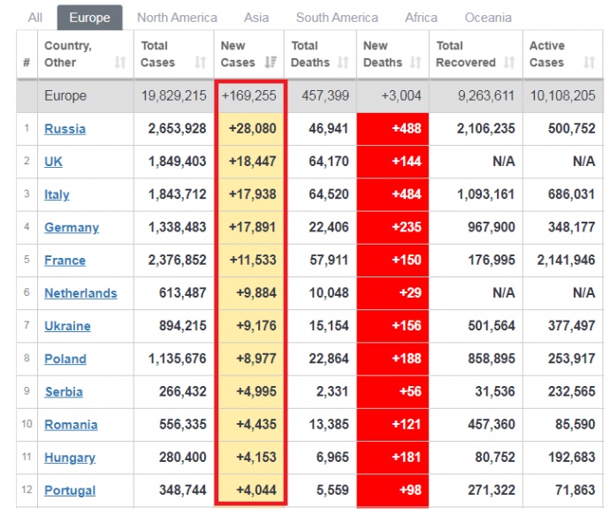Детали: В странах Европы лидерами антирейтинга по количеству новых случаев COVID-19 является Великобритания, Италия, Германия, Франция, Нидерланды и Украина. В соответствующем мировом антирейтинге Украина на 12-м месте.