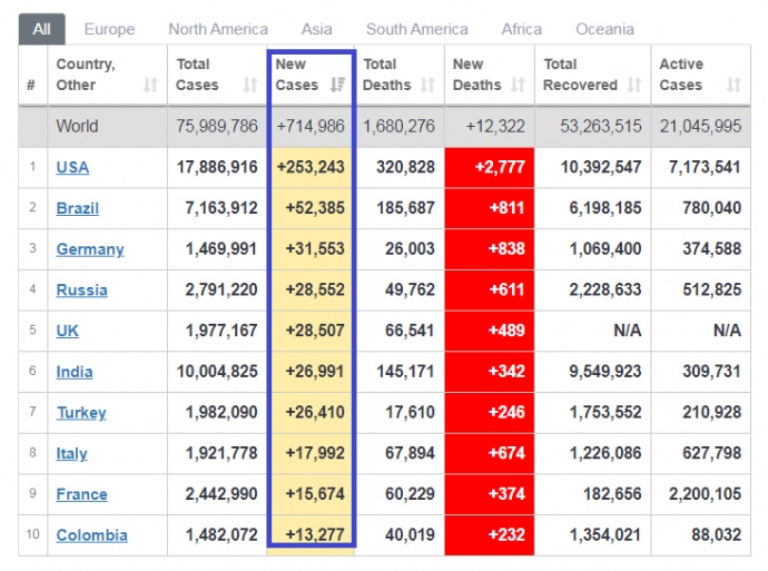 По состоянию на 19 декабря в мире за сутки диагностировали более 700 000 новых заражений COVID-19. Умерло за последние сутки 12 322 ковид-больных.