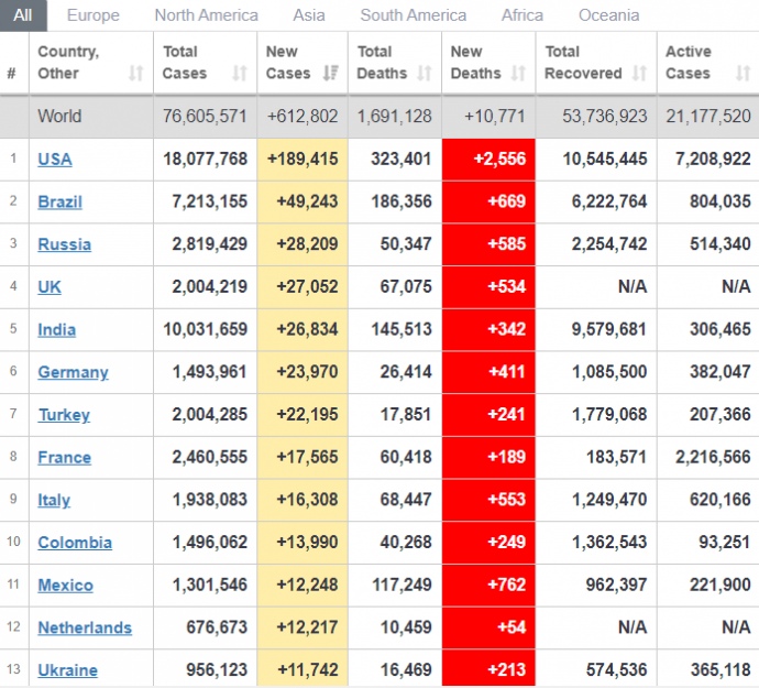 За минувшие сутки в мире диагностировали почти 613 тысяч случаев заболевания коронавирус, всего в США, Бразилии и России.