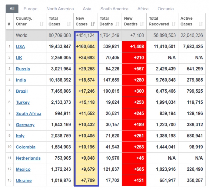 По состоянию на 26 декабря в мире за сутки диагностировали более 450 000 новых заражений COVID-19. Умерло за последние сутки 7108 ковид-больных.