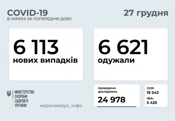 В течение субботы, 26 декабря, в Украине обнаружили еще 6113 случаев Covid-19, при этом болезнь унесла жизни 72 зараженных.