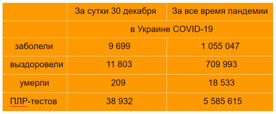 За сутки 30 декабря в Украине диагноз COVID-19 подтвердили 9 699 людям, выздоровели 11 803 человека, однако 2 704 больных попали в больницы, а 209 пациентов умерли.