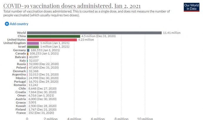 Детали: В общем уже ввели около 1 миллиона доз препарата. На каждые 100 граждан в стране приходится 11,55 дозы вакцины.