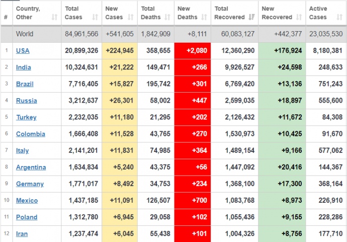 По состоянию на 2 января от коронавирусной инфекции вылечились 60 миллионов больных, на данный момент лечится – более 23 миллионов человек.