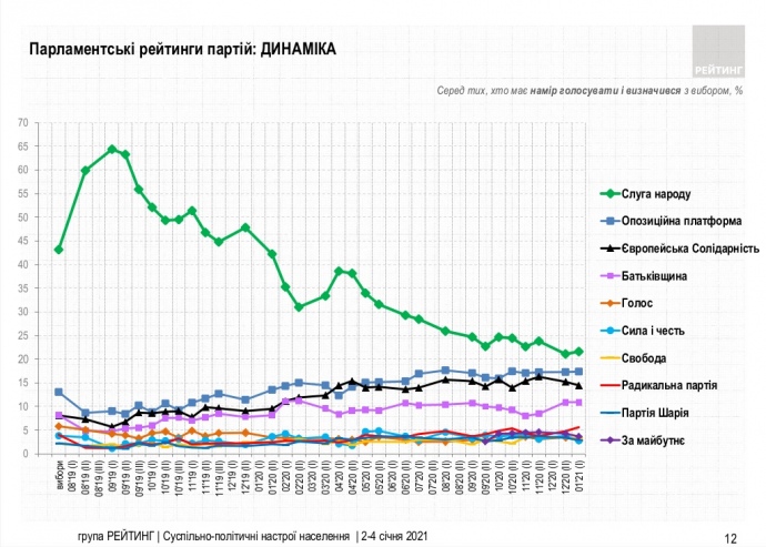 В тройке лидеров парламентского рейтинга - партии "Слуга народа", "Оппозиционная платформа - За жизнь" и "Европейская солидарность".