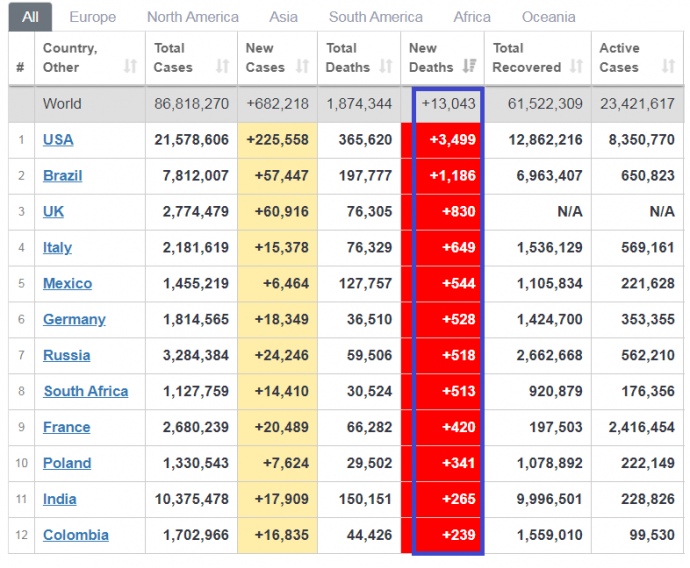 По состоянию на 5 января в мире за сутки диагностировали более 600 тысяч новых заражений COVID-19. Умерло за последние сутки 13 043 ковид-больных.